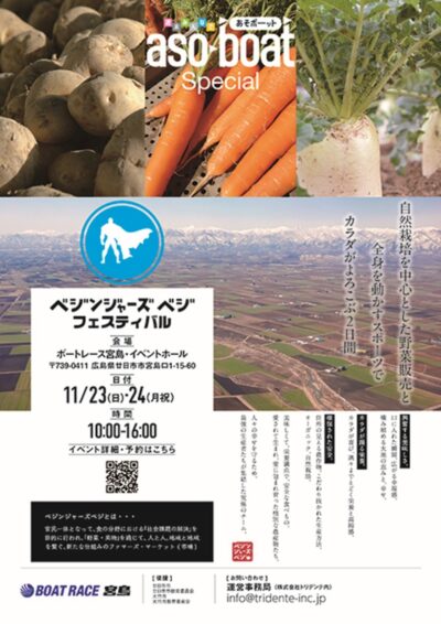 『ボートレース宮島』では、11月23日(日)・24日(月・振休)に、「ベジンジャーズベジフェスティバル」が開催されます。全国の農家から直送された野菜の販売や、スポーツ能力測定などを行う“からだ作り”をテーマとした体験型マルシェです。走る・跳ぶ・登るといった移動動作で心身を鍛える「パルクール体験会」や「パルクール鬼ごっこ体験会」も行われますよ!遊びを通して運動の楽しさを学ぶことができるので、家族で参加してみてはいかがでしょうか。