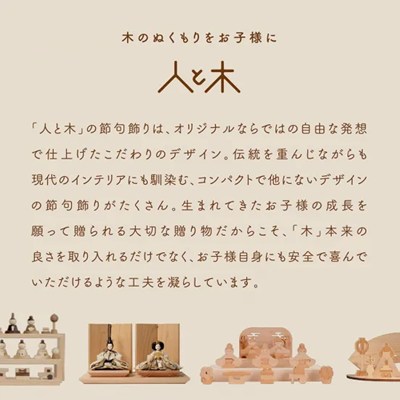 「人と木」の雛人形は、無垢素材を使用した温かみのある質感が特徴です。また、人と木のプロダクトデザイナーと熟練の職人によって丁寧に作られた雛人形は、洗練されたおしゃれな印象。和室にはもちろん、洋室など、幅広いお部屋の雰囲気になじみやすいデザインで、子育て世代の支持を集めています。