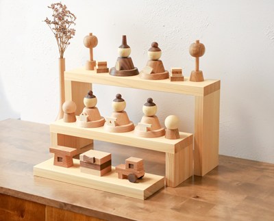 着色料を使わず、異なる色の無垢木を使用することで華やかに仕上げている点も特徴です。3段ある台座は、重ねたりずらしたり、思い思いの飾り方ができるのも人気のポイント。