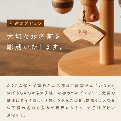 さらに、悩んで決めた大切なお子さんの名前を、刻印できるオプションも。世界にひとつだけの雛飾りを手にできます。こちらも専用の化粧箱がセットになっているため、片付けもラクにでき、来年まで大切に保管できる仕様です。