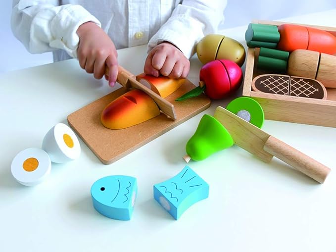 木のやさしい質感とかわいらしいデザインが魅力のおままごとセット。子どもの小さな手でも扱いやすいように、それぞれの食材は少し大きめに設計されています。面ファスナーでくっついた食材を包丁でザクっとカットする感触がやみつきに♪子どもが舐めても安全な塗料が使用されているのもうれしいポイントです。