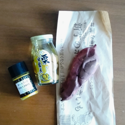 そこで目をつけたのが、スーパーで販売されている焼き芋。しっとりとやわらかいので、裏ごし不要です。ほかに必要な材料は、栗の甘露煮と色づけのためのターメリック。(ターメリックはなくても大丈夫です)