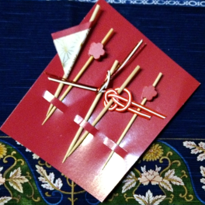 わが家のおせちでよく使うのが、水引や梅飾りが付いたピック。お正月用品が並び始めるころ、100円ショップで買っています。ピックに黒豆をいくつか刺して入れると、良いアクセントになるんですよ。