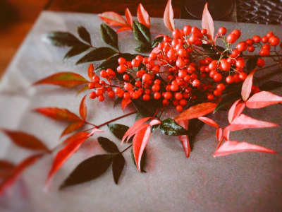 自宅や実家の庭に南天の木がある人は、ぜひ使ってみて♪南天の葉や実をお重の中にあしらうと、一気に華やぎますよ。この写真のように、ボリュームたっぷりの南天をテーブルに置いておくだけでも◎。