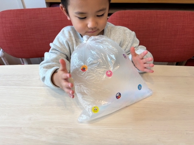 ちなみにわが家では、ポリ袋を使った自作の風船を使用。ポリ袋の中にはビーズや細かく切ったストローを入れ、外側にはシールを貼りました。風船バレーをする前から子どもの笑顔が見られるのは、自作だからこそ♪