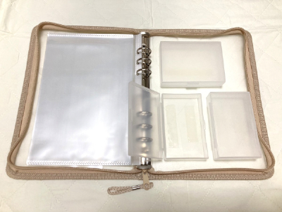 クリアファイルをリングに挟んだあと、カードケースを裏表紙の内側に貼り付けていきます。今回は両面テープを使用しました。