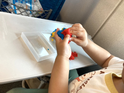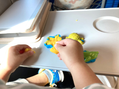 ファイルを開けるなり、夢中で遊び始めた息子。お気に入りはこむぎねんどで、型にねんどを詰めるのにハマっていました♪なお、ねんど板を持参していないため車内のテーブルを直接使用。遊ぶ前後には除菌シートで拭いています。車内で騒いだらどうしようかと不安でしたが、ときどき「カメさん♪イルカさん♪」などとおしゃべりはするものの、集中して遊んでくれました。車窓に目もくれず、20分ほどの食事タイムを除いた約1時間をお出かけファイルで遊んで過ごしました。