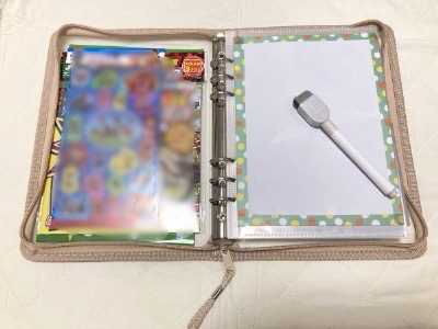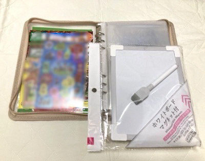 ファイルの表紙裏には内ポケットがついているので、シールとシールブックを挟みました。また、クリアポケットにはお絵描き用の紙を入れておきました。