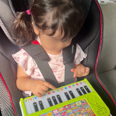 祖父母の家へ行くときなど、お気に入りのおもちゃを少しだけ持って行きたいときに便利なのが、「ヤマハのピアノえほん」。娘が0歳のころは鍵盤を叩いて音を鳴らすことを楽しんでいましたが、2歳になった今では、童謡の音楽を聴いたり、イントロクイズで遊んだりしています。