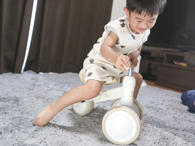 わが家では、息子が1歳の頃にD-Bike mini ワイドを導入しました。淡いカラーで可愛く、どんなお部屋にもなじむのが嬉しいポイントです。三輪車は姿勢がしっかりしてから使えるものが多いですが、D-Bike mini ワイドは、対象年齢が10ヶ月からなので、伝い歩きくらいの時期から長く遊べています。