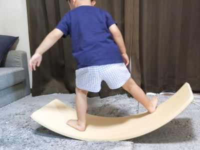 木の温かみが感じられるこのバランスボードは、耐荷重200kgの丈夫さで、子どもはもちろん大人も一緒に遊べます。バランスを取りながら立ったり、親子で端に座ってシーソー遊びをしたりと、多彩な遊び方が可能です。