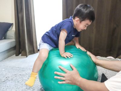 おすすめの遊び方は、大人が支えたボールに子どもが自分で乗り10秒ほどバランスを保てるか挑戦する方法。親子で楽しめ、気軽に全身運動ができるのでわが家では定番です。玉転がしやボールを持ち上げるなど、工夫次第でいろんな遊び方ができ、室内運動を楽しめます。
