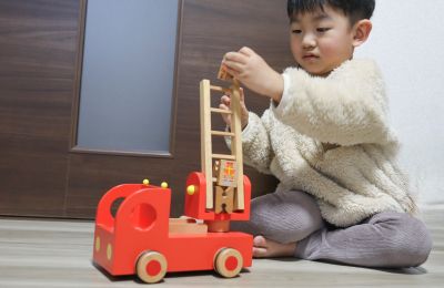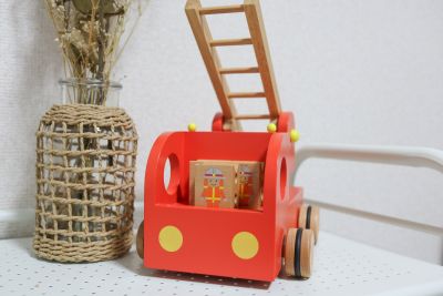 ひと目で男の子の心をつかむ消防車モチーフの木のおもちゃです。