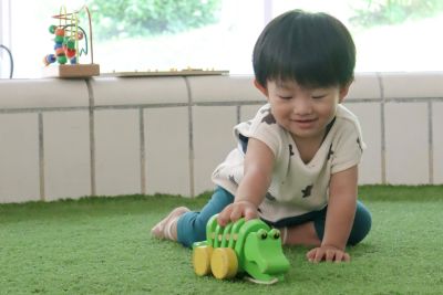 ワニをモチーフにした、木のぬくもりを感じられるおもちゃです。付属の紐を引いて歩くと、体をくねくねと揺らしながら、リズミカルについてきます。