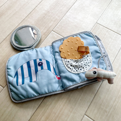 表紙のぞうの耳がガサガサと音がするようになっていたり、鏡や歯固めがついていたりと、赤ちゃんの興味を引くしかけが施されています。布製なので軽くてやわらかく、繊細な赤ちゃんの肌を傷つけにくいアイテムです。小さな赤ちゃんも自分の手でページをめくり、夢中になって遊んでくれますよ。かばんにサッとしまいやすい本タイプなのも特徴です。