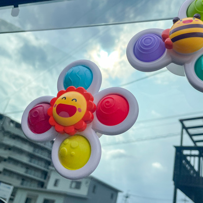 裏側に付いている吸盤で車の窓に固定して遊べる、ハンドスピナーのおもちゃです。隣に座ったパパ・ママがハンドスピナーを手でくるっと回すと、滑らかに回転してくれます。3個セットで、車の中だけでなくお風呂の鏡に貼って遊ぶこともできます。娘はくるくる回るハンドスピナーをじっと見つめ、止まると「あ!あ!」ともう1回動かしてほしいと伝えることが多くありました。
