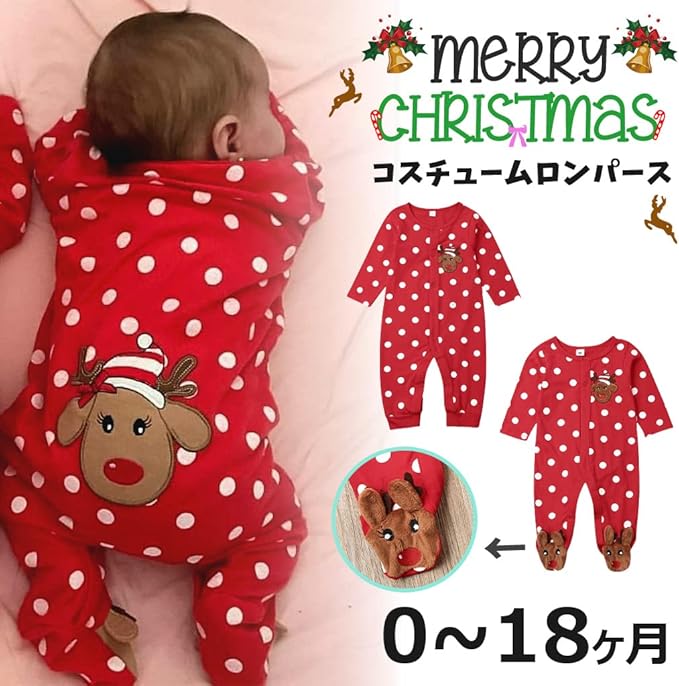 クリスマスシーズンにぴったりの、赤ちゃん向けカバーオール兼コスチュームです。ロンパースタイプで、0~2歳くらいの赤ちゃんにぴったりのサイズ感。足首までホックが付いているので、着替えやおむつ替えもスムーズに行えます。記念撮影やプレゼント用にもおすすめの一着!お尻に付いたトナカイのイラストが可愛さをさらに引き立てます♡