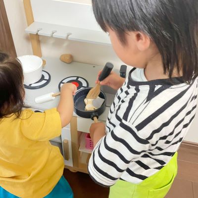 長女の2歳の誕生日プレゼントに購入しました。キッチンは1歳次男がつかまり立ちをして遊ぶのにちょうどいい高さ。セットでついているフライ返しやお鍋などは、木製なので耐久性にも優れています。くるくる回るレンジのつまみやとけいの針は、低月齢の子どもの指先トレーニングにぴったり!左側のドアは、開閉時指をはさみにくい設計になっているのもうれしいポイントです。年齢を重ねるごとに、収納に使っていた扉部分をレンジや冷蔵庫に見立てたり、レストランをひらいたりと、遊びの幅が広がっていきます。