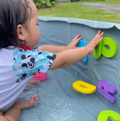 シンプルながらも、遊び方は無限大!1歳次男は、お風呂やプールの壁にペタペタ貼って手の使い方を勉強中。3歳長男は、数字やアルファベットを順番通り並べています。最初のうちは反転して置くことが多かったのですが、徐々に正しい向きに!5歳長女は、簡単な単語や自分の名前などをつくっています。並べる以外にも、長男と長女が好きなのは、宝探しゲーム。大人が家の中にアルファベットを隠し、どちらが多く見つけられるか競い合っています。