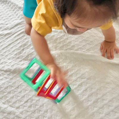 四角や三角など、さまざまな形のブロックをマグネットでつなぎ合わせて遊びます。付属品もたくさんあって、車や観覧車など、創造力が駆り立てられるのが魅力!低月齢のうちは、ブロック同士をくっつけたり、マグネットボードに貼ったりするだけでも十分楽しめます。成長するにつれ、車やタワーなど、創造力を働かせながらさまざまな作品を作り上げています。マグネットブロックは、はめ込むタイプと違って、壊れやすい一面も。子どもが力加減を学ぶのにもぴったりです。