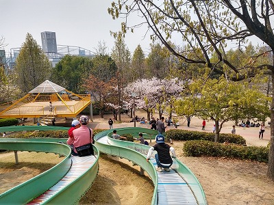 アスレチックには2本のローラー滑り台がついていて、子供たちが歓声を上げながら滑っています。公園は緑が多く春は桜も咲きお花見もできます。