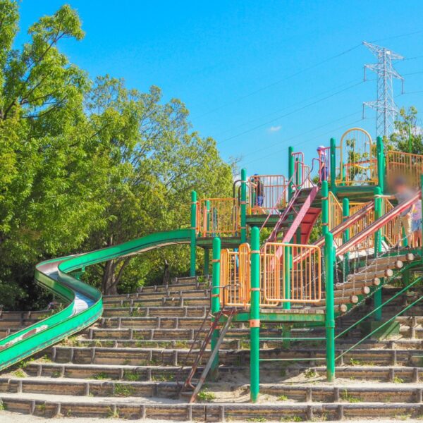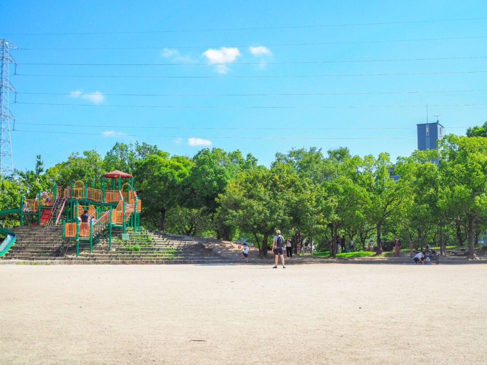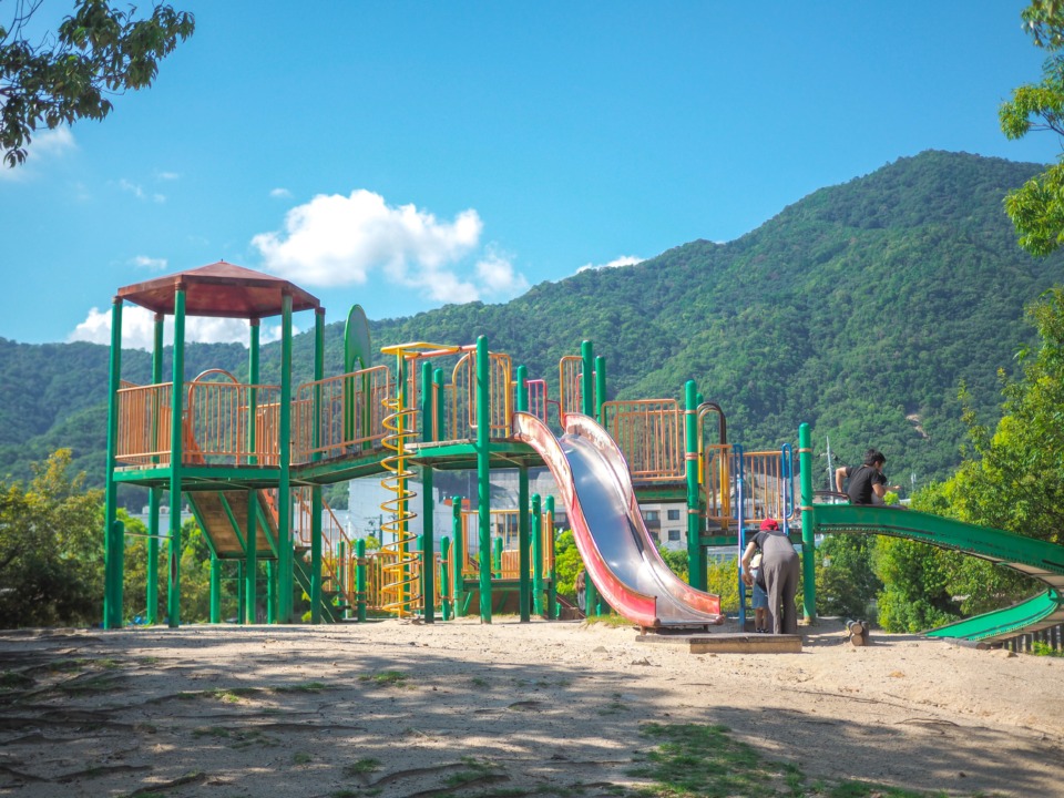 園内は大きめの複合遊具が設置されています。滑り台はローラータイプのものと、高低差のあるものの2本。他に鉄棒やロープ登りなどが楽しめます。遊具のすぐ近くには走ったりボール遊びをしたりできるグラウンドもあります。緑の多い公園なので、木の下にレジャーシートを敷いて日影を確保できるのも嬉しいポイントです。