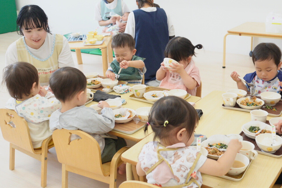 園内調理の給食は、素材や出汁の取り方にもこだわっていて、美味しいと評判。離乳食やアレルギー食にも対応しています。