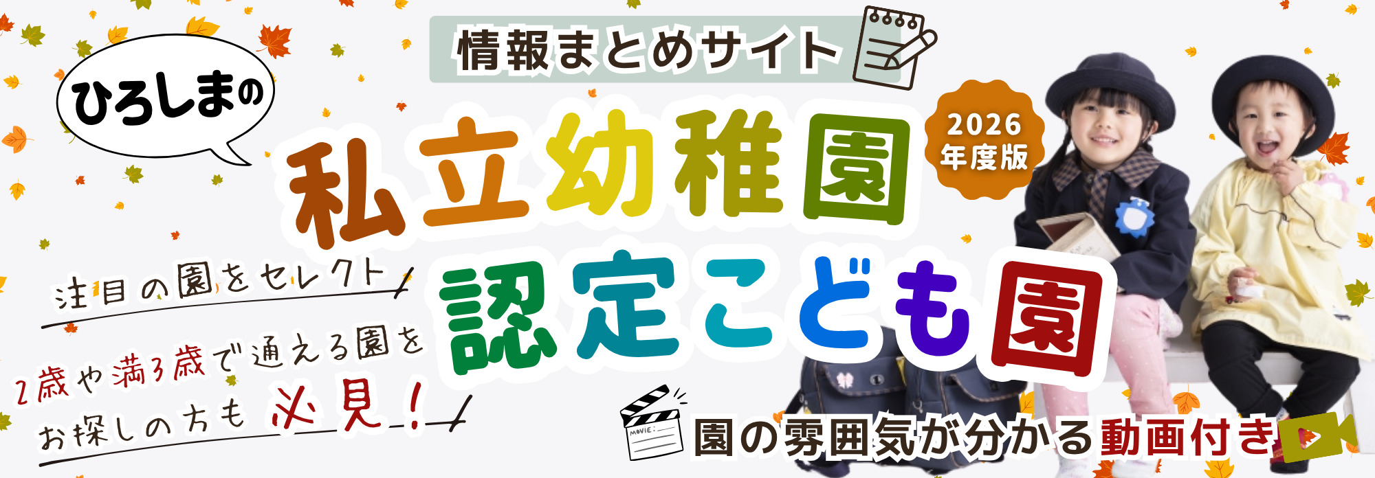 広島で、お子さんにぴったりの私立幼稚園・認定こども園を探しているパパ・ママ必見! このサイトでは、広島で人気の私立幼稚園・認定こども園を詳しくご紹介♪ 動画付きで、園内の様子や実際の雰囲気などもお伝えします。 ◆この春から通える幼稚園をお探しの方 ◆2歳や満3歳から通える園をお探しの方 ◆今後の幼稚園探しの参考にしたい方 などなど…ぜひ、理想の園探しの参考にしてくださいね。
